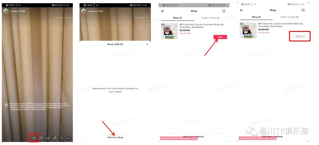 在商家直播界面找到购物袋图标,并点击"Add from Shop"为直播间添加商品