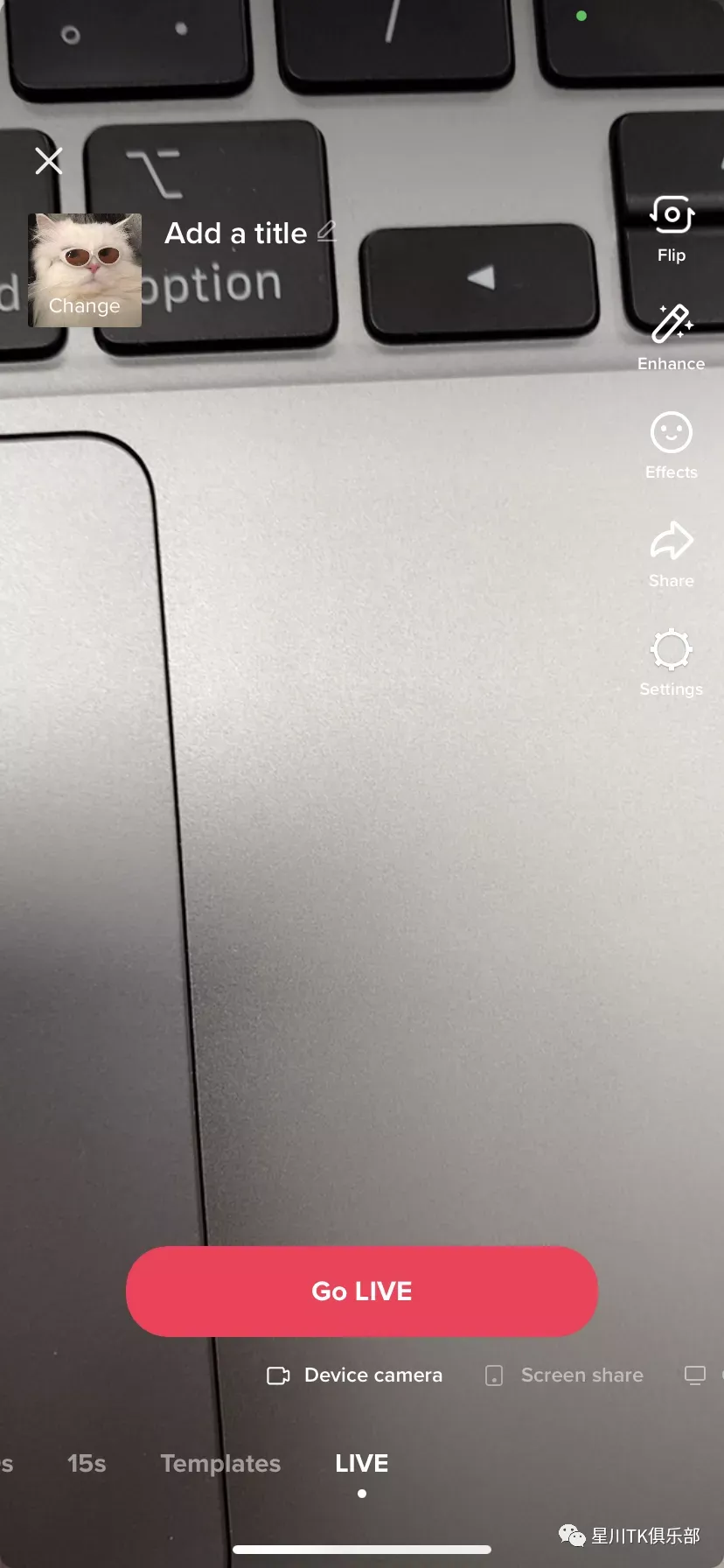添加完商品后,在主页点击“+”进入直播界面,设置好直播封面和标题后,点击"GO LIVE"开启直播。